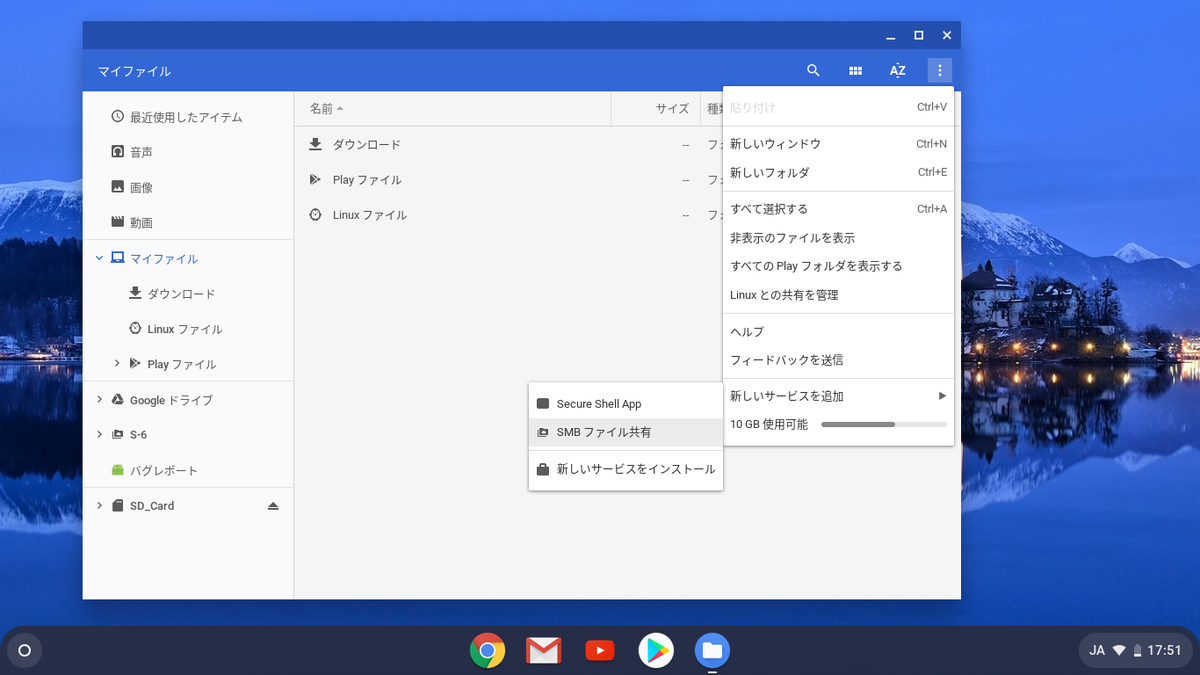 Chromebookは標準でSMBクライアントの機能をもっているため、WindowsやSamba等のSMBサーバにそのまま接続できます。