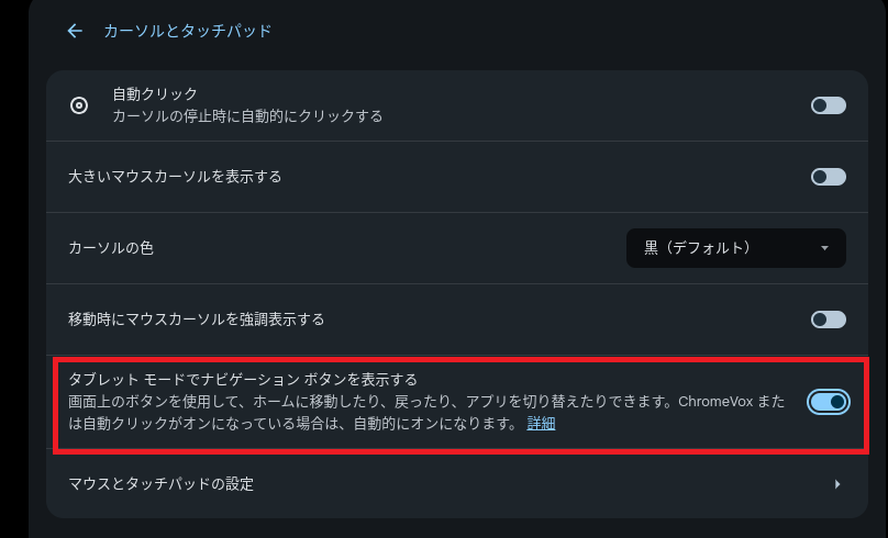 2024-06-01 【Chromebook】タブレットモードでナビゲーションボタンを表示する Chromebookの非教育的活用方法 備忘録。Chromebookをタブレットモードにしたとき、画面下部にナビゲーションボタンを表示する方法。Androidアプリを動かすときはナビゲーションボタンで操作した方が便利かもしれない。 Lenovo Google Chromebook Ideapad Duet タブレット ノートパソコン (10.1インチ WUXGA液晶 MediaTek Helio P60T 4GB 128GB eMMC スタンドカバー Webカメラ 無線LAN) 【2022年5月発表】 ZA6F0112JP 【chromeOS】 Lenovo Amazon 設定のユーザー補助から「カーソルとタッチパッド」を選択。 「タブレットモードでナビゲーションボタンを表示する」をチェックする。 タブレットモードに切り替えたときに画面下部にナビゲーションボタンが表示される。操作方法はAndroidスマホと同じ。 とらぶるだいあり〜・てぃーちゃームービー版